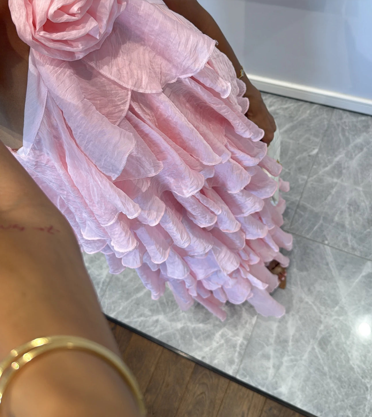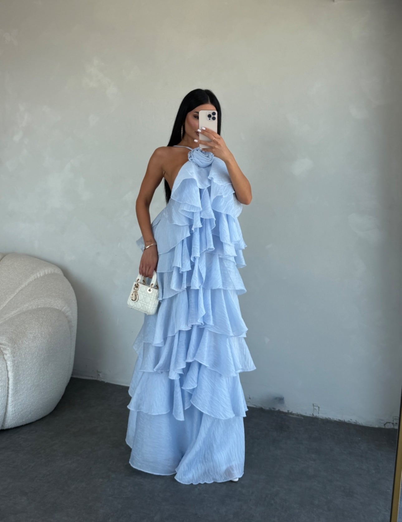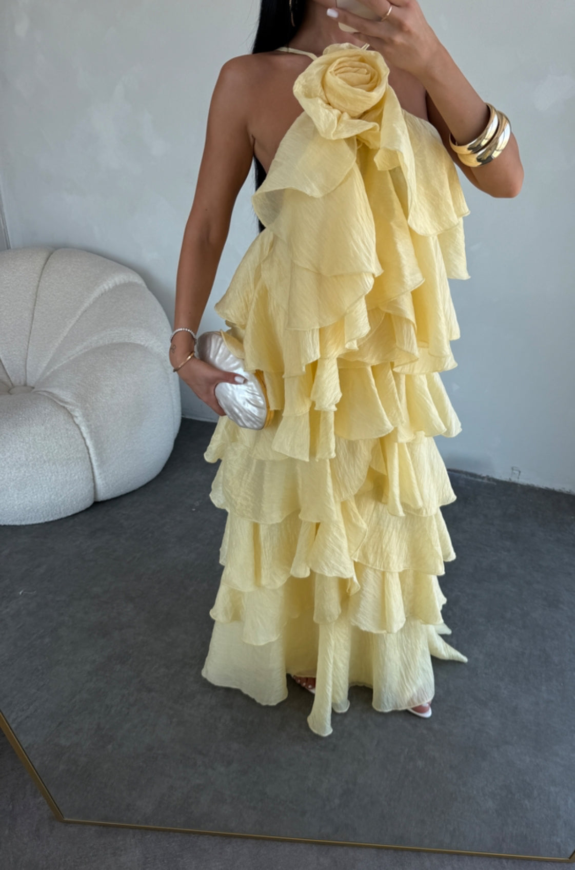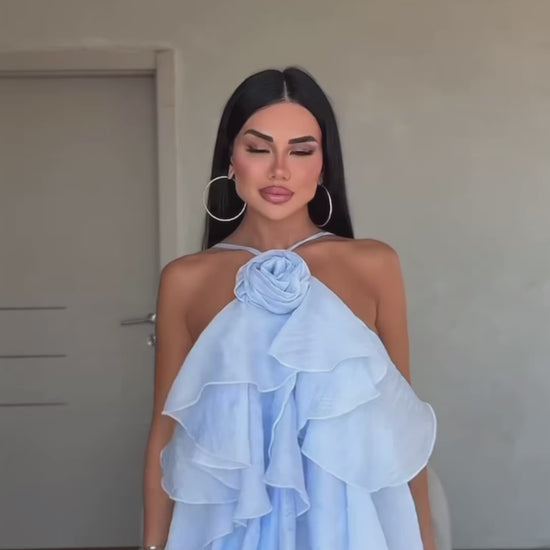 Elegante e scenografico, questo abito è realizzato in un leggero tessuto plissé effetto stropicciato. Il design a balze multiple dona movimento e volume, mentre il maxi fiore sul décolleté aggiunge un tocco romantico e sofisticato. Perfetto per cerimonie, eventi o serate speciali.