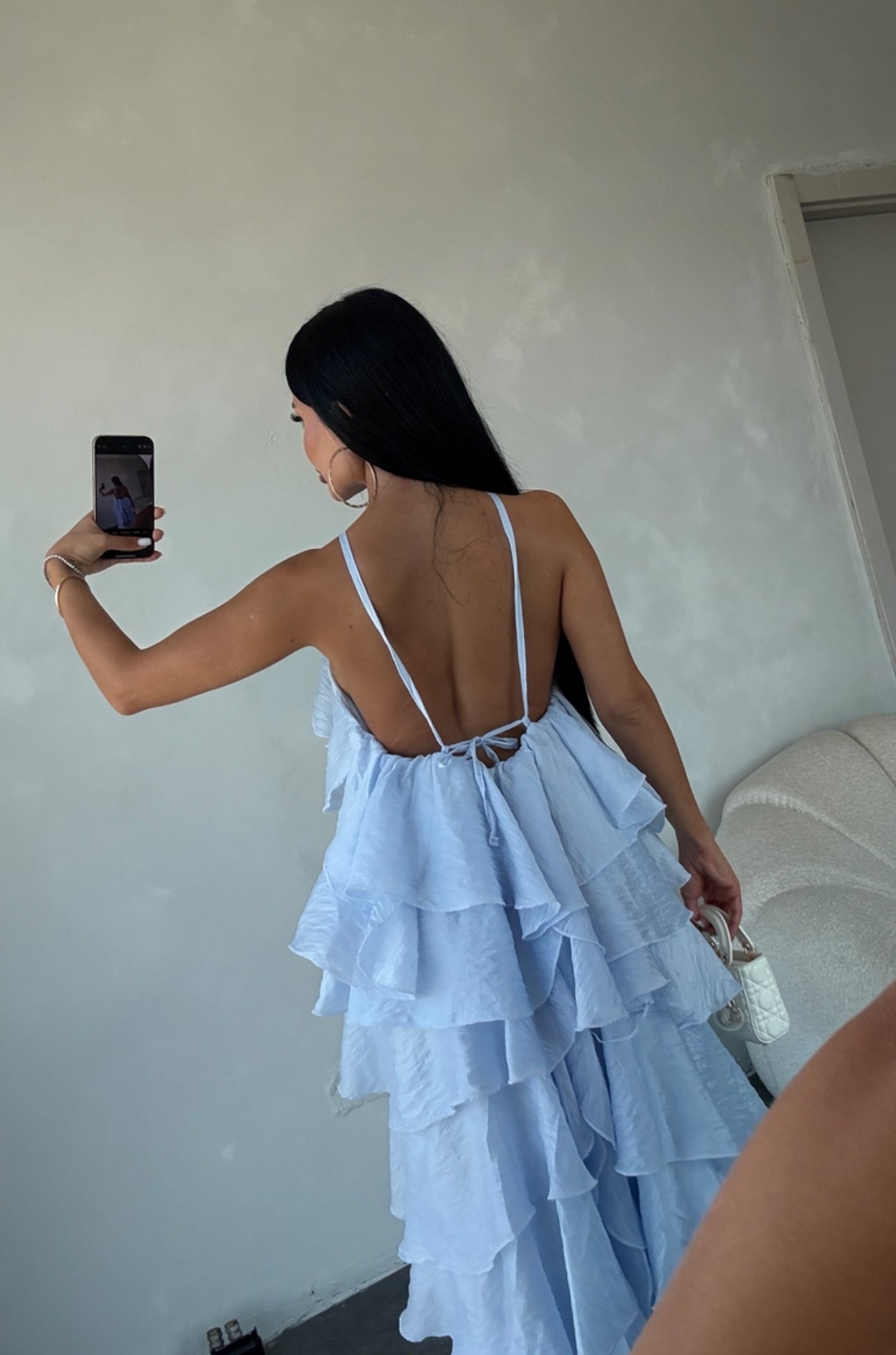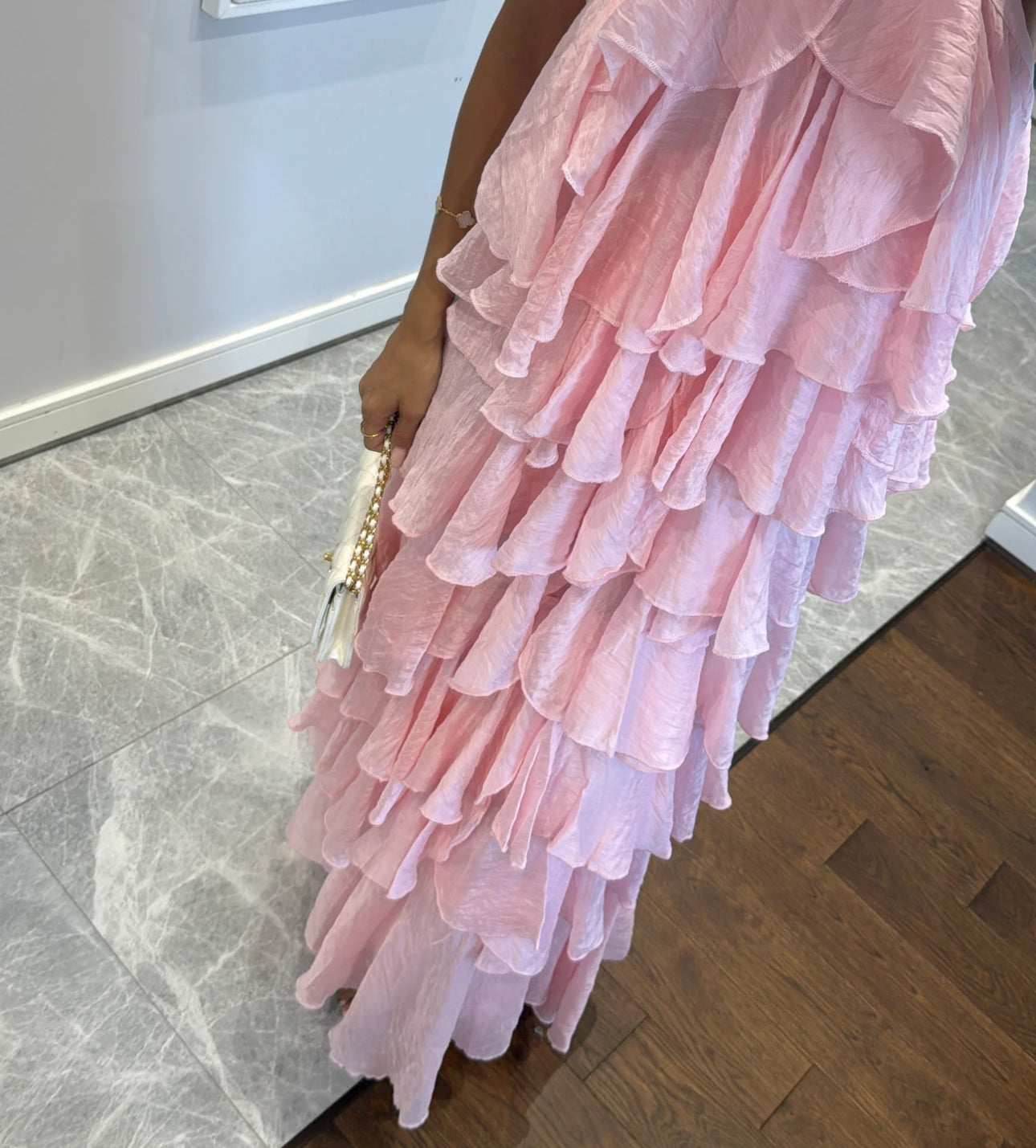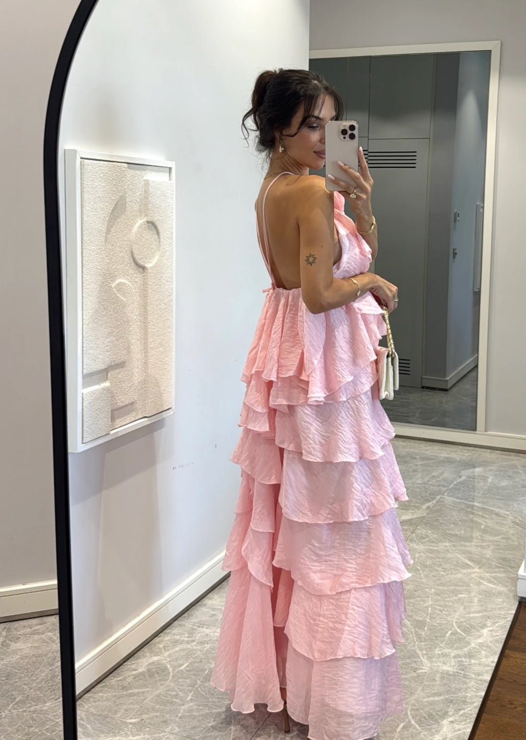 Elegante e scenografico, questo abito è realizzato in un leggero tessuto plissé effetto stropicciato. Il design a balze multiple dona movimento e volume, mentre il maxi fiore sul décolleté aggiunge un tocco romantico e sofisticato. Perfetto per cerimonie, eventi o serate speciali.