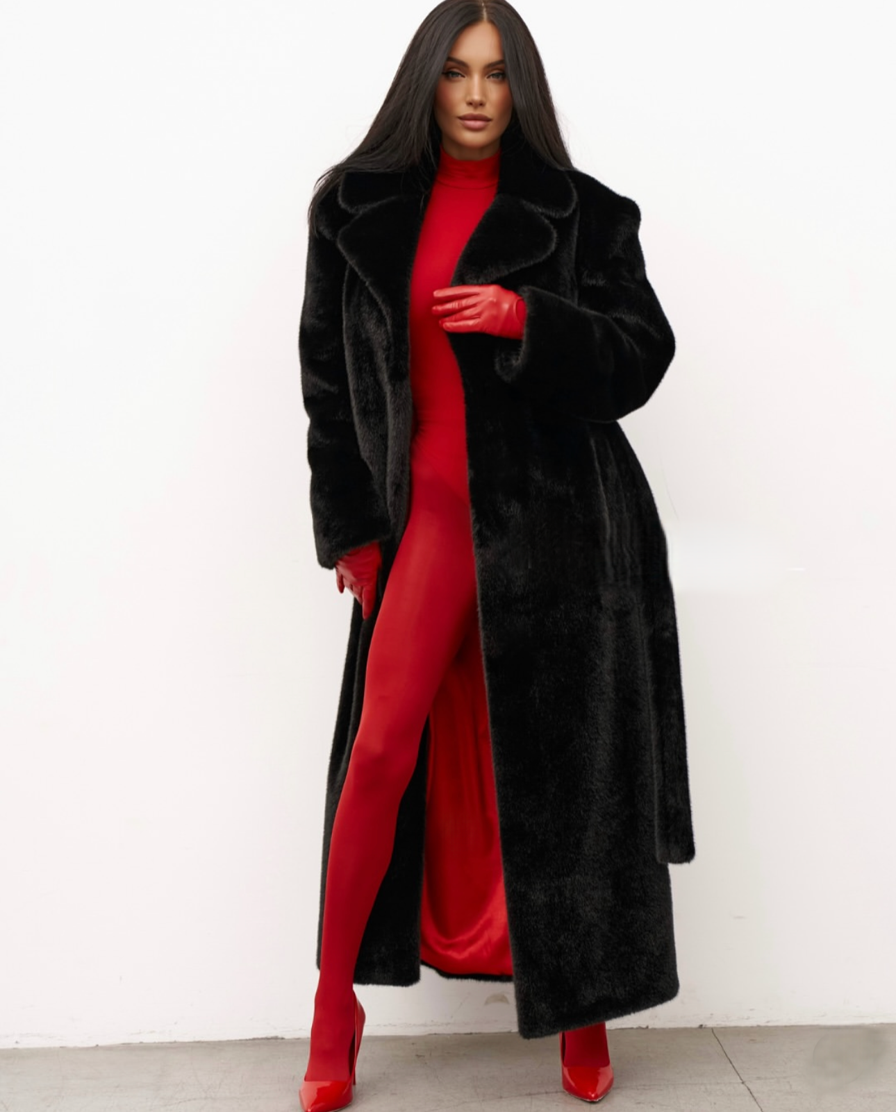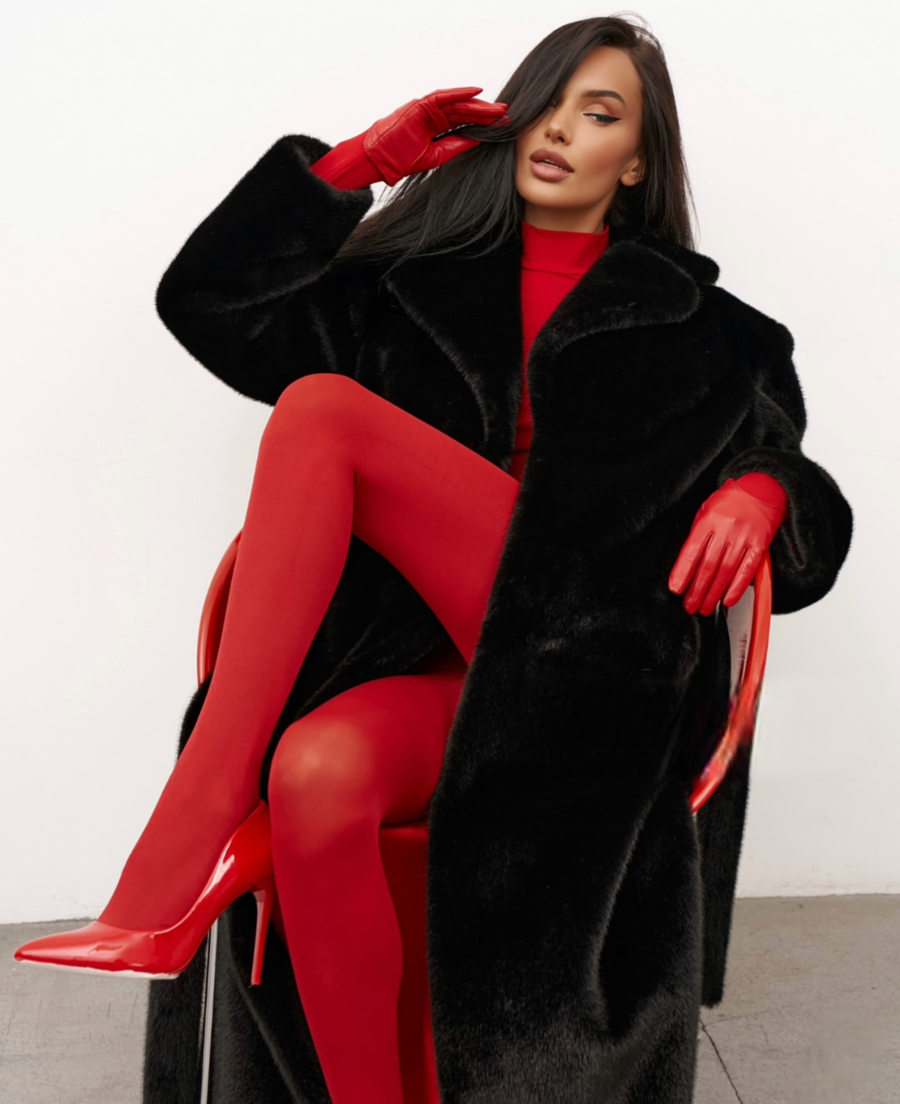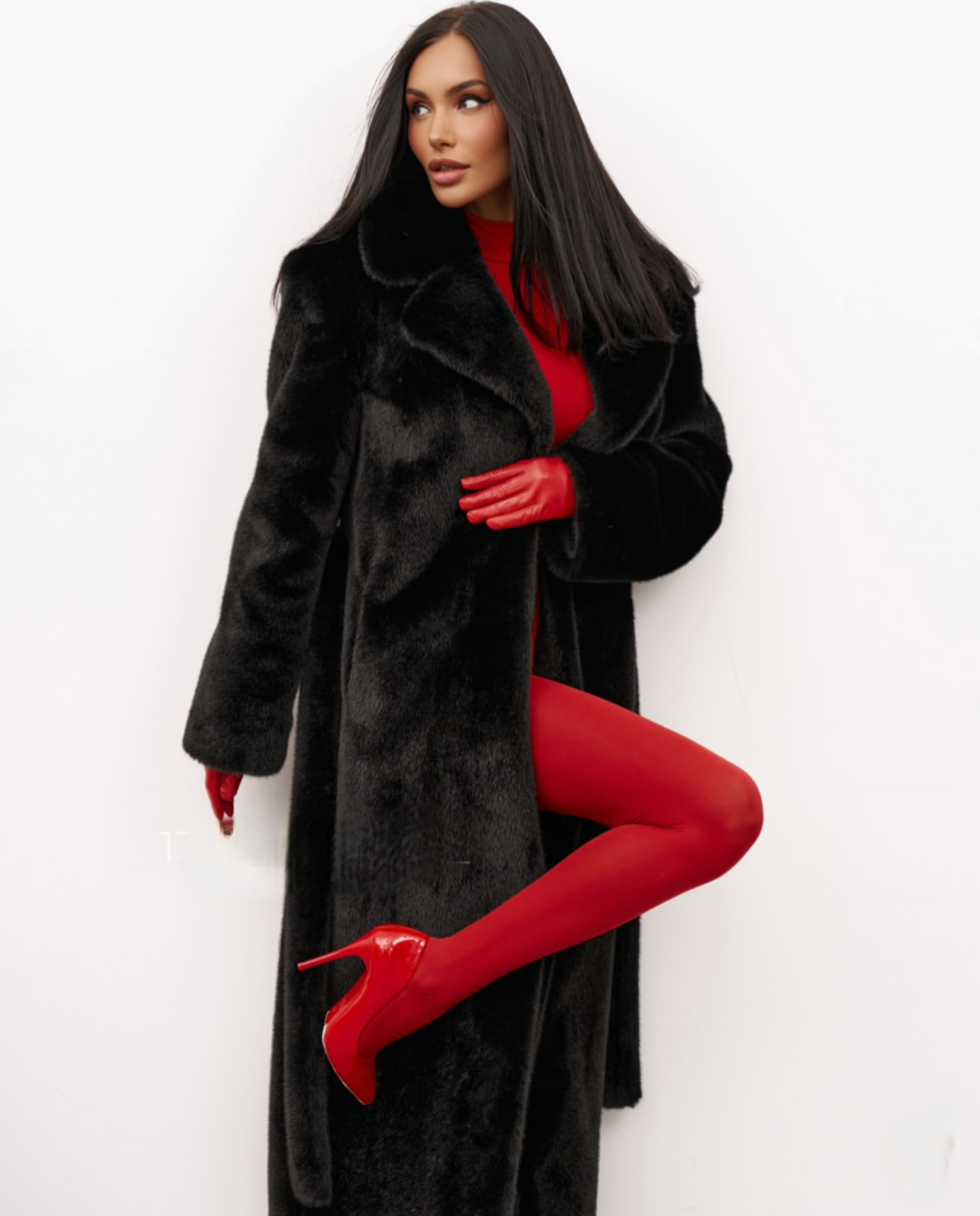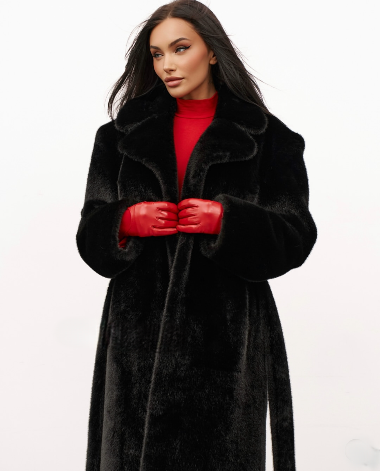 La pelliccia Alesia in visone ecologico è realizzata con materiali di alta qualità e presenta una fodera interna in raso rosso con cinta coordinata. Morbida, calda e resistente all'acqua, questa pelliccia offre comfort e stile per i mesi più freddi. Regala una sensazione di lusso senza danneggiare gli animali.