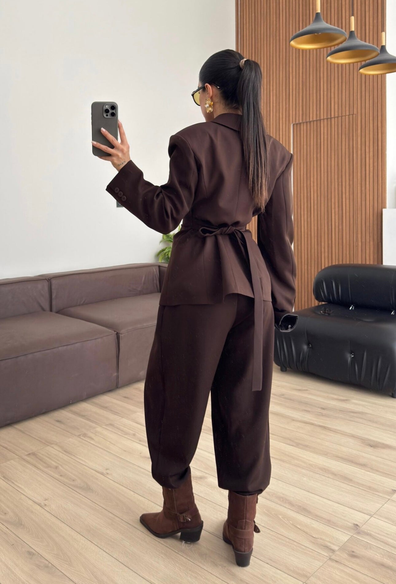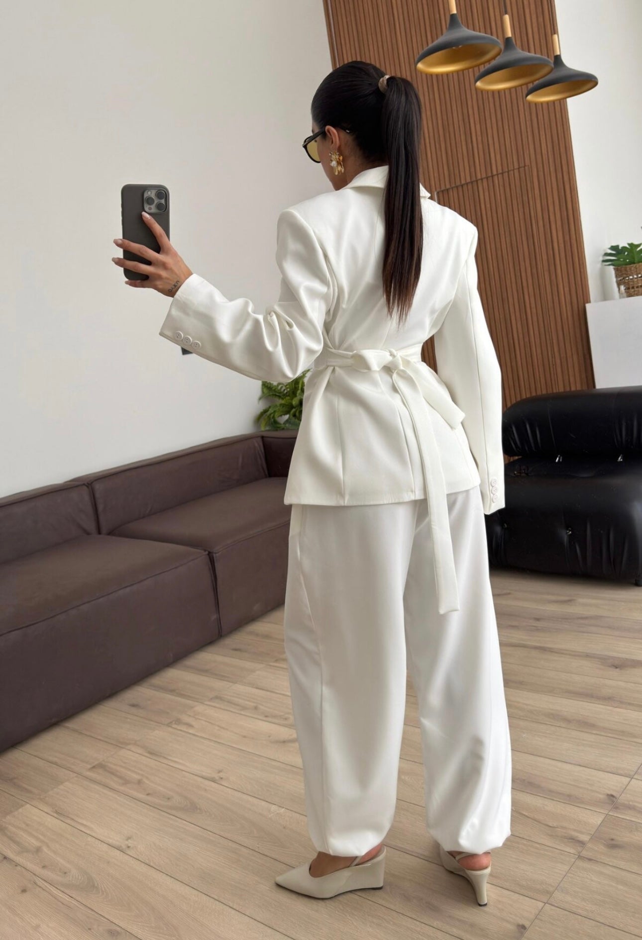 Completo tailleur dal design moderno e sofisticato, composto da giacca sartoriale con spalle strutturate, rever classico e chiusura incrociata. La cintura integrata con bottoni decorativi stringe il punto vita valorizzando la silhouette e creando un elegante effetto corsetto.