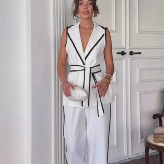 Questo tailleur smanicato LARA è perfetto per un look elegante e sofisticato. Il blazer presenta un bordino bianco e una cinta coordinata che aggiungono un tocco di classe, mentre il colletto a blazer lo rende versatile e adatto a molteplici occasioni. Completamente privo di maniche, questo tailleur ti permetterà di muoverti con libertà e freschezza.