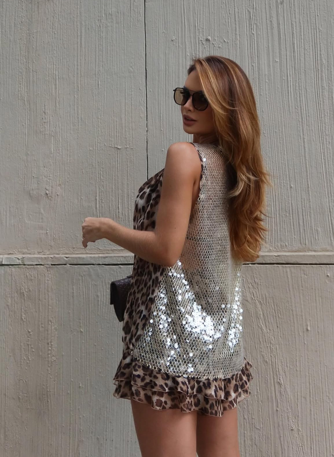 Tris THAIS è un coordinato elegante e raffinato che comprende una maglia scollata a V, una schiena a rete paietata, un reggiseno e dei pantaloncini con lacci in coordinato. Il coordinato è perfetto per un look chic e sofisticato, ideale per ogni occasione. Con materiali di alta qualità e un design accattivante, questo coordinato ti farà sentire bella e sicura di te.