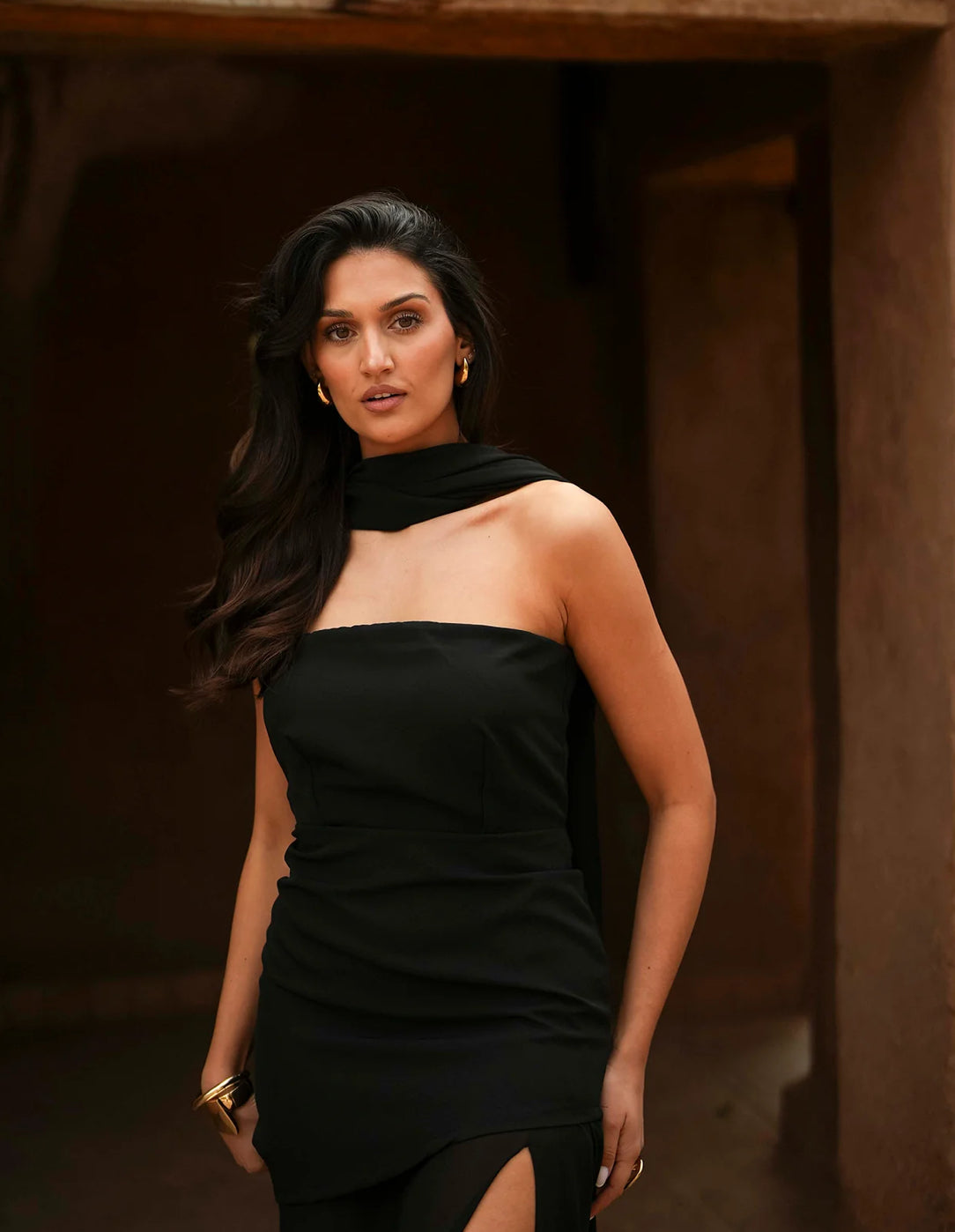 Questo elegante è caratterizzato da un design raffinato e seducente. Presenta un corpetto senza spalline che valorizza le spalle e il décolleté, accompagnato da una lunga sciarpa in tessuto coordinato che aggiunge un tocco di sofisticatezza. La gonna, con uno spacco laterale audace, offre un equilibrio perfetto tra eleganza e sensualità, permettendo libertà di movimento.